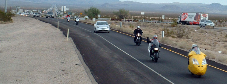 Meet Garth LaComb Garth has been following our progress on the internet and is already involved in fuel economy in the Seattle area. He stopped by to help out. We welcome like-minded folks like Garth and will do what we can to support him. This meeting may lead to a Vetter-style Challenge in the North West. We certainly hope so. Garth followed along all the way to Barstow to get the beautiful pics of us riding - above. Thank you, Garth. He also mentioned that he counted at least 3 people speeding ahead, stopping their cars and scrambling out to take pictures of you all riding streamliners. Still more were taking pictures from their vehicles or pacing the group to stare and discuss. Garth was on top of his car to take this one: | ||||||||||||||||||||||||||||||||||||||||||||||||||||||||