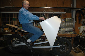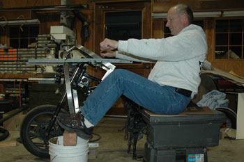 A variety of riding positions Alan is mocking up the new handlebars. They must be about 6" higher and farther back. Alan wants to be able to sit comfortably and also be able to move about to stay comfortable. After all, this is to be a serious cross-country machine. The main mount for the nose is a very strong crossbar. It will be used for the forward controls as well as providing a feet-forward sitting style. | |||||||||||||||||||||||||||||||||||||
