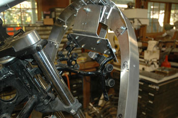 I check to see how the nose curve will fit over the bigger Ninja front wheel. It looks fine. Alan pretends he is cruising with his feet on the pegs, holding his hands in a comfortable position. We will have to make new handlebars for this new riding position. Alan thinks it feels fine, too. | |||||||||||||||||||||||||||||||||||||