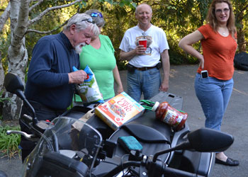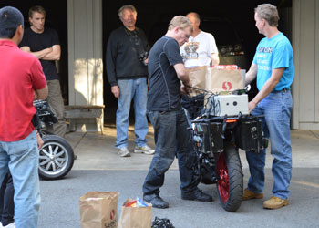 Misc. Notes Carrying the groceries: Carrying a useful load - such as four bags of groceries - is a major requirement of the Vetter Challenges. "Failure to carry" is probably the biggest reason 2-wheelers are not used more. Here is how we will deal with this: Before departure, the four grocery bags must be fitted acceptly into each machine. For clarification (posted July 10, 2013): All items must be in the bags The bags must be upright. When available, a real wife, like Carol Vetter, will decide if the bags are being packed to her satisfaction. If any part of the bags are exposed, you will have to ride in the Challenge with the grocery bags filled and in place. The reason is simple: If the groceries are exposed, you and your machine will be aerodynamically "dirty." (You will probably loose some groceries, too) In addition, you will consume more fuel as your engine tries to push you through the air. If the groceries are within an enclosure, they are not likely to affect the mileage. | |||||||||||||||||||||||||||||||||||||||||||||||||||||||||||||||||
