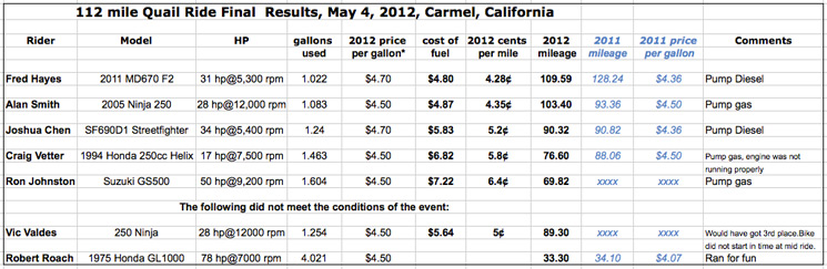 Here are the final results again. Compare this year's numbers with last year's numbers. Because the cost of fuel varies and the length of the ride varies, measuring the winner in dollars and cents of fuel used, is not very useful, is it? Lets see if we can make some sense of this | ||||||||||||||||||||||||||||||||||||||||||||