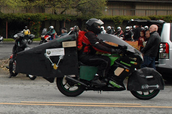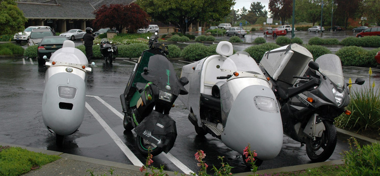 The difference between first and second place was 7¢ Look at these two bikes. They are the same Ninja! No engine changes. No gearing changes. Stronger winds. The only difference is the real streamlining. Alan comments: "I agree that this year's Quail competition was very close. I think my gas mileage would have been better if I slowed down a little but I kept up with the pace bike at speeds up to 85 MPH. Personally I think the pace on Carmel Valley Road was a little to fast. | ||||||||||||||||||||||||||||||||||||||||||||