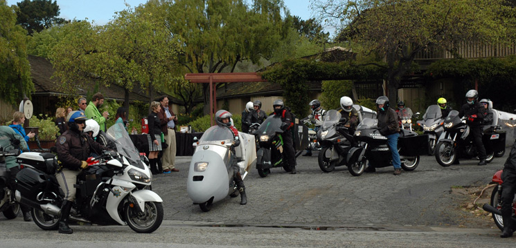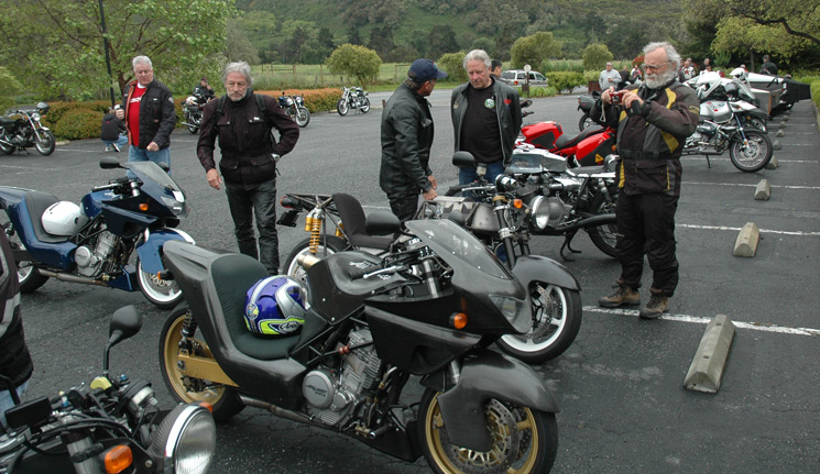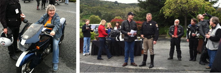 Carol liked Perry's Alligator. Meanwhile, the rain let up and Gordon McCall and Sgt. Ray Faulk, our CHP ride leader explained the rules of the ride. Rob Talbott, red shirt on the right, owner of Talbott Wineries, hosted our pit stop along the way. Rob rode with us, the "Fast" group, as opposed to the "Slow" group, which was made up of vintage bikes. The "Slow" group had left a half hour earlier. | ||||||||||||||||||||||||||||||||||||||||||||