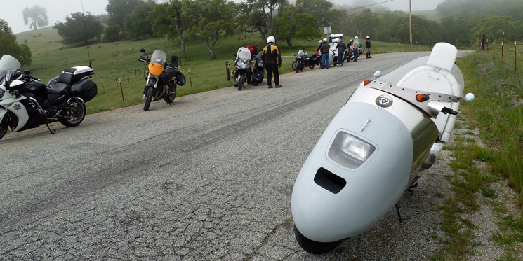 Where was everybody? It turns out that the Vetter Challengers were way out front, right behind Sgt. Faulk and his big Concours 14. The rest of the bikes were several minutes behind us at our first break at the top of the pass. So much for streamlining and low horsepower, huh? It was all downhill after that. When we got to the bottom, we turned north into the 35-40 mph headwind. Even with the powerful headwind, I hit 77 mph a couple of times on my streamlined Helix. The Vetter Challenge bikes led the pack all the way back to the track. | ||||||||||||||||||||||||||||||||||||||||||||