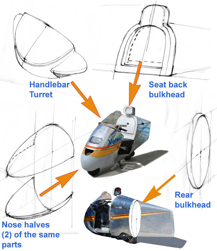 The five major fiberglass parts are needed to build your own streamliner I have spent the past 5 years developing the Last Vetter Fairing. I know what to do for best mileage, comfort and desirability and this is it. It is time for you to decide if you want one. It is time for me to decide whether or not to produce kits. The molds don't exist yet. If enough of you are interested in buying this kit, I will spend the winter finishing the molds. The shape is for a 24" wide streamliner. The length is variable. Can you make a better one? I doubt it. I began work on this at the end of 2007. Read all 60 Chapters of its development. Can you do it for less? I doubt it. The price will be around $2000 plus shipping... maybe another $250. I don't want your money now. I just need to know if you are likely to buy this kit. | |||||||||||||||||||||||||