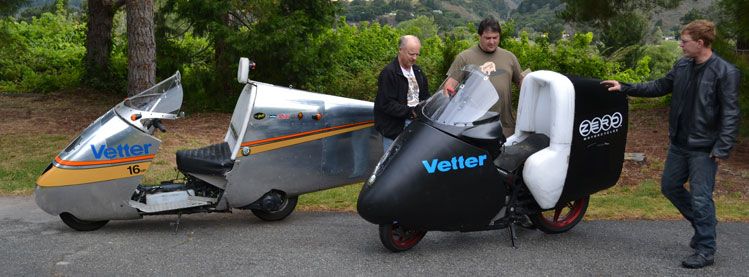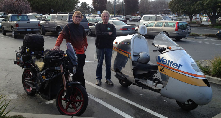 Kraig Schultz, a Vetter Challenger from the midwest told me that Terry Hershner was riding an electric Zero from Florida to California and suggested that we meet. I chased Terry down in Santa Cruz early February of 2013 and we had lunch. I told him how a streamlined Ninja went twice as far as an un-streamlined Ninja on the same amount of gasoline. Would streamlining do the same thing for an electric bike? If so, it could be a serious game changer. We agreed that we would find out. Getting the equipment ready I went to work finishing the tooling for my Challenge Streamlining while Terry went to work stuffing more batteries and chargers into his Zero. We were ready to combine our efforts in early March. | ||||||||||||||||||||