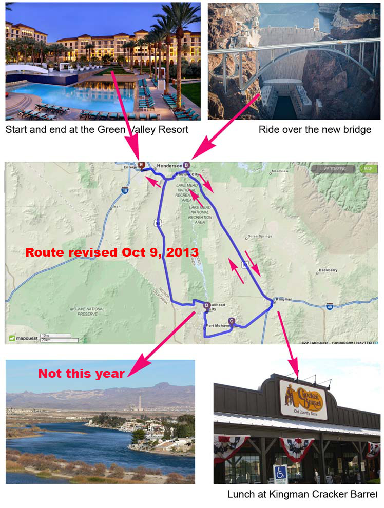 Held in conjunction with the AMA's Hall of Fame Inductions at the Green Valley Resort, this is a big weekend for American Motorcyclists. Friday night is the gala banquet where the newest inductees into our Hall of Fame are honored. Sign up now and meet America's legends of motorcycling. To inquire about rooms at the Green Valley Resort, call (866) 782-9487. The specific schedule for the Vetter Challenge Thursday: Carol and I will be checking in Wednesday evening. 7:30-8:30 AM Breakfast with the Vetters at the best location at Green Valley Resort. To be determined and announced here. 8:45 AM Assemble in parking lot, Carol's grocery bag test. Remember, all 4 bags must all be loaded in your bike within 45 seconds. All fuel topped off. Photo session. Edwin Colon will videotape, same as last year. 9:30 AM depart. Follow our leader Paul Golde to the Kingman Cracker Barrel. Top off tank as necessary. Figure on a 1 1/2 hour layover. Note: As of Oct 9, 2013, the route has been shortened. At first, we thought it would be 250 miles. But when our Leader, Paul Golde, began fine tuning, he discovered that it was more like 289 miles. To shorten it, we will just return the way we came. The route is 200 miles total. This will be a more relaxed ride for all of us... especially for me as I am recovering from a major hip replacement. I know you will understand. Return to Green Valley Resort. I will see if the winner can be announced Friday night at the Banquet. | ||||||||||||||