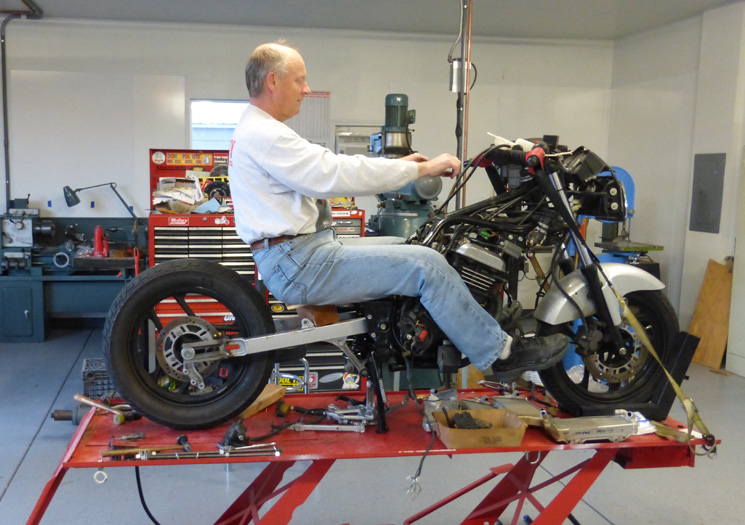 Alan extended the swing arm 5". This gave him room him to sit 10" lower. But he had to remove the airbox.* Duplicate controls on his front-mounted foot rests allow him to shift and brake from the footpegs or forward controls. *Redesigning the airbox may become his biggest problem. | ||||||||||||||||||||||||||||||||||||||||||||||||