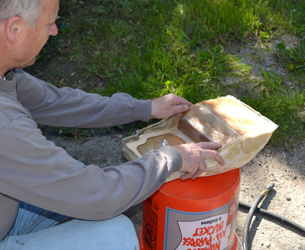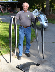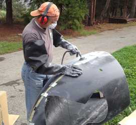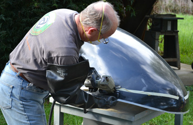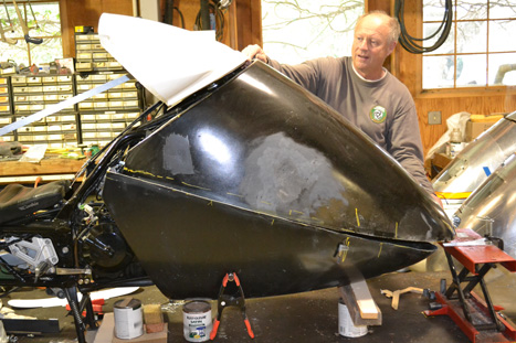 Finishing the nose is a matter of grinding down the high spots and adding fiberglass to the low spots until it looks smooth. The worst part is itchy arms from the fiberglass. Alan wears rubber arm-length gloves. Note the front wheel is back on. When you make the cut out according the the way we have learned above, the wheel turns perfectly - the first time - in an opening not too big or too small. | ||||||||||||||||||||||||||||||||||||||||||||||||