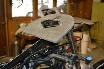Everything begins with this plane of rotation Because he will sit so much lower, Alan needed to move the bars back and down. This 3/8" aluminum plate makes it easy. The handlebars and Turret Top will mount to this plate The rest of the nose is keyed to this plate | ||||||||||||||||||||||||||||||||||||||||||||||||