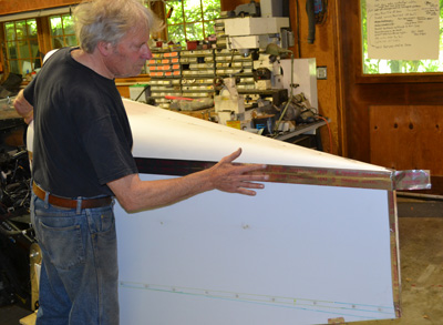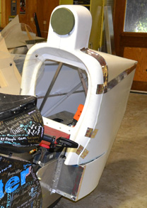We had a problem: After two weeks of work, Terry was still sitting almost as high as he was before. This was because we had gone to great efforts to keep his rear batteries within the 24" width of the front streamlining. But the nose was no longer 24" wide... | ||||||||||||||||||||||||||||||||||||||