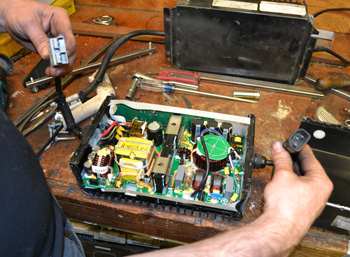 This is what is inside a charger. 110 v plug in on the right... 72 v DC out on the left. Terry has ten of these mounted at the front of his Zero. That is about 200 pounds of chargers. | ||||||||||||||||||||||||||||||||||||||