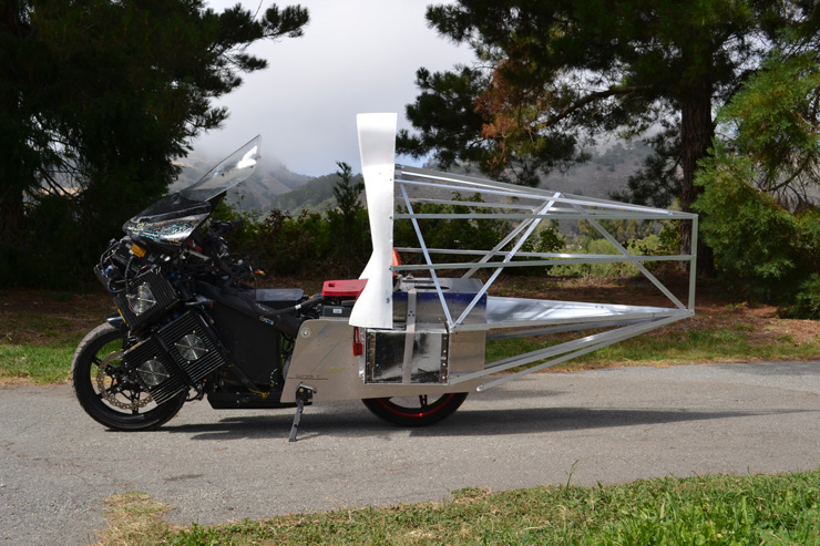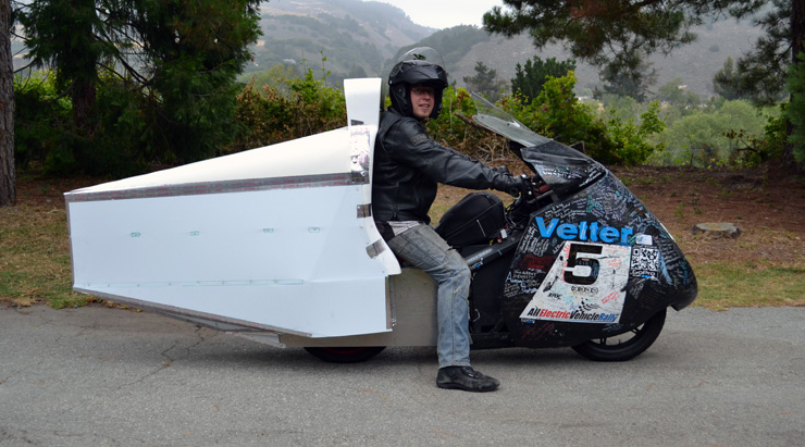 July 2, 2014: Terry Hershner and his mighty Streamlined Zero ZF-18. Ready to set new electric records Postscript dated July 15, 2014: Terry never left California. Sitting on a bare metal seat pan instead of cushions, he rode his Mighty ZF-18 anyway, jamming his back. That was the end of his cross country riding for a while. We missed him but he was able to make his presentation at Vintage Days via SKYPE: | ||||||||||||||||||||||||||||||||||||||