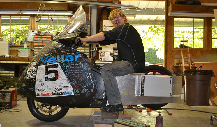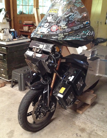 When he charges, Terry consumes four automobiles worth of power! Four J1772 nozzles at once! Even tho, it still takes 45 minutes to fully charge. But then he can go 125-150 miles at 70-75 mph. No electric motorcycle in the world can do this. Terry Hershner is a true pioneer. Chargers are heavy. But if you want to charge fast, you have to have lots of them. Each charger weighs about 20 pounds which means that Terry is carrying 180 pounds of chargers! The best place to keep the weight is up front, which is why Terry had to spread the fairing out. | ||||||||||||||||||||||||||||||||||||||