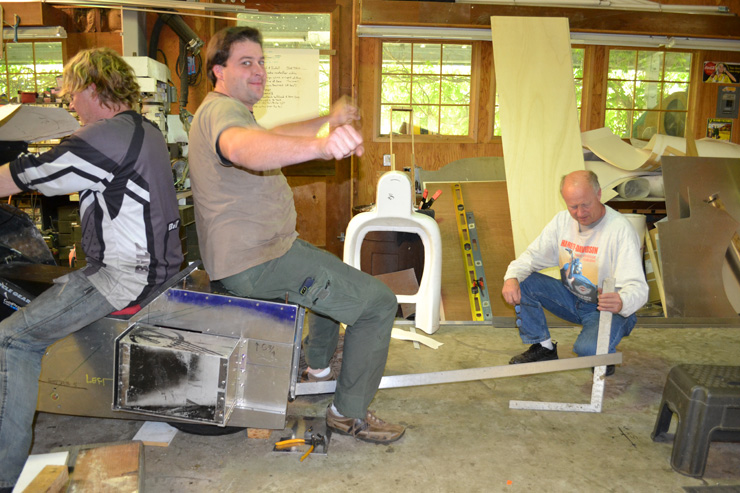 Terry sitting, batteries in place, Zak bouncing and Alan measuring. We are trying to figure out the lowest the tail can be and not drag in road dips - like when leaving an angled driveway. | ||||||||||||||||||||||||||||||||||||||