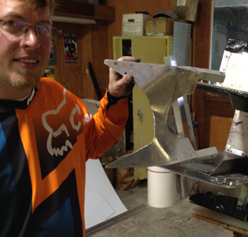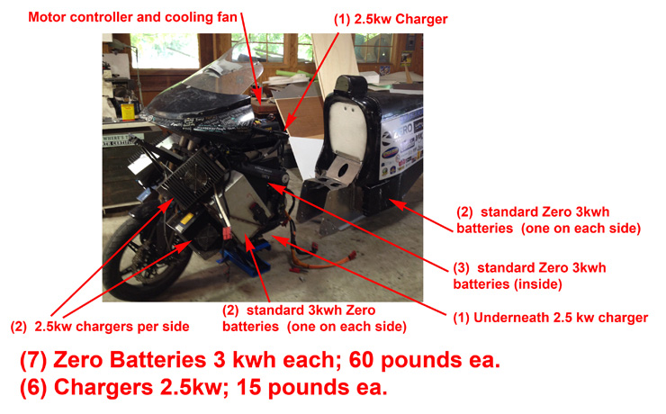 In previous chapters, I explained how I like to attach major components by just three bolts: Since the rear structure for Terry's Zero is held on by only three bolts, It was easy to remove it and replace the swing arm. This simplicity also allowed us to drill two new holes at the bottom to rotate the rear structure up into its new position. In the picture above, you can see the plates we "scabbed" onto the rear structure to provide metal for the new holes. You can also see how Terrry packed his heavy chargers and batteries up front. | ||||||||||||||||||||||||