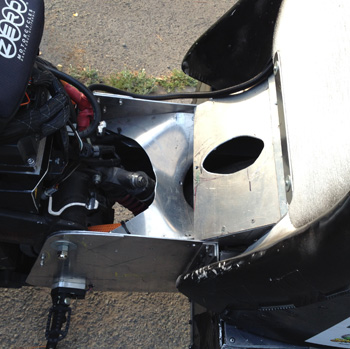 This could have been a disaster for Terry. Imagine the rear wheel locking up at 70 mph. The force twisted the aluminum structure we had just made. In truing things up, we discovered that the sudden stop also bent his swing arm. | ||||||||||||||||||||||||
