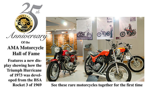 AMA Ride Representatives Rob Baughman and Chris Harrison will lead us 77 miles to the AMA Hall of Fame Museum in Pickerington. Each leg of the ride will include 10 miles or so of freeway. When we arrive at the Museum, the electric bikes will probably want to plug in somewhere. The rest of us can also refill as ling as we hang onto receipts. We will have a 1 1/2 hour break at the Museum. Challengers will be allowed in for free. I will give a short talk at the new Triumph Hurricane exhibit. We will have plenty of time to eat lunch. There are great restaurants nearby. Upon returning to the gas station by Splash Harbor, we will fill our tanks. I will collect all the receipts and the Challenge will be over. It may take some time for the electric bikes to refill, which means we will not know the winners until the next day when they will be posted on my web page. Again... all are invited to ride with us to see what is possible. | ||||||||||||||||||||||||||||||||||||||