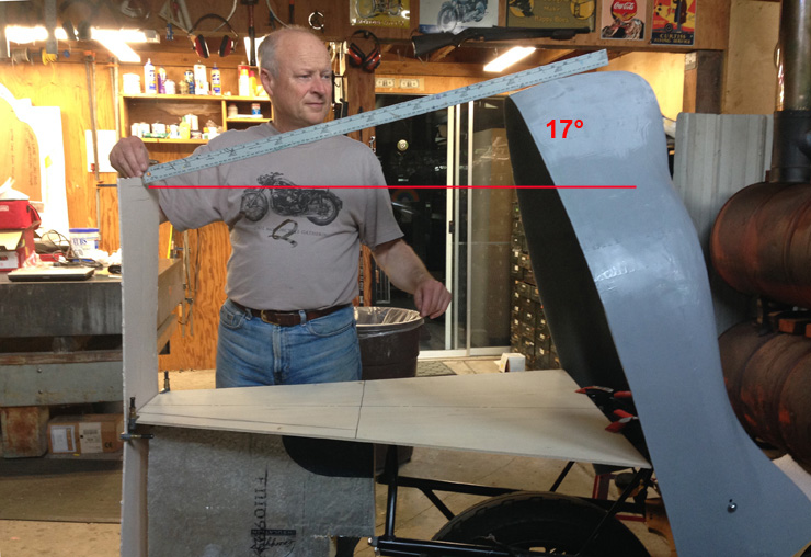 Assuming that the 17° closing angle would be the best compromise, we made a temporary plywood tray and clipped the back off. We will make the part that continues to a point a separate piece. That way, the pointed section can be optional. | |||||||||||||||||||||||||||||