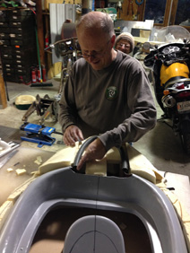We put it on Alan's LowBoy Ninja. Making a new tail from a seat bulkhead is a relatively easy job. The big question now is how to access what we store in the back. It sure would be nice to have an opening at the side. Alan and Terry were wondering. | |||||||||||||||||||||||||||||
