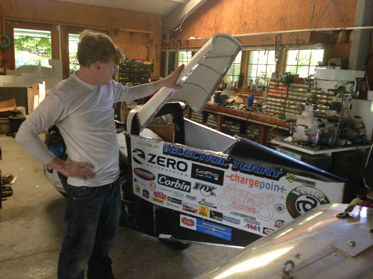 Alan has been thinking about what would happen if he was ever "Rear-ended." It would not be good for the metal tray to be driven into his back. Therefore, we split the rear into two pieces, attached with plastic screws. If Alan is rear ended, the plastic screws will shear allowing the extended portion to telescope forward, collapsing into itself. Think about that when you build your streamliner. Electric Terry came up with an access hatch: | |||||||||||||||||||||||||||||
