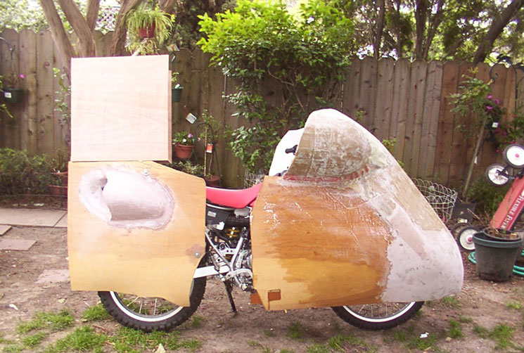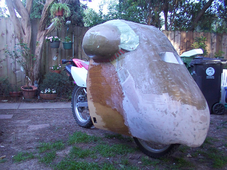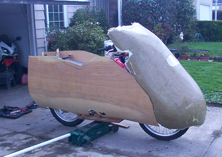 April 20, 2010, Alan reports in: Here is an up-date on my streamliner’s progress. Things have changed a lot since the photo on your web site, dated and titled “Feb 2, 2010: There is a perfectly good Honda CRF 230L inside the plywood taco”. I have taken away and added a lot of material to the plywood taco to get where I am now, see attached photos. For the tail section being abruptly cut off, I’m relying on the “Kamm Effect” to keep my gas mileage up. I can always extend the tail at a later date. My new 15-tooth countershaft sprocket should arrive tomorrow. Since the photos were taken last night I have trimmed the tail section some. The trunk might be too tall and may need additional trimming. There are some additional molded parts that I want to make but it might have to wait until after the Quail Event. I still have to dig all of the white molding foam from the nose. See attached photos. A lot of long weekday nights and two more weekends left before the Quail Event. And again today, April 21, 2010: For me this weekend is crunch time to finish my streamliner for the Quail Event. On my streamliner the rear section is done but needs sanding and primed. The trunk needs some more work but is basically done, needs to be primed. The front needs to be finished, sanded, primed, etc. The good news it is almost there. Depending on development time my streamliner might only be a static display at the Quail Event. I might not have the time to properly road test it. I would prefer to ride my streamliner to the Quail Event. The current cold weather is slowing me down. This weekend is another 3-day weekend for me to get things done. I have recruited some of my neighbors as test subjects to see how they fit in my streamliner. I’ve gotten some good suggestions from them. It helps get a different perspective of how everything fits. My 15-tooth counter shaft sprocket finally arrived but no time to test it without the streamliner shell. To gear my streamliner any higher will require changes in the rear sprocket. I’ve already hit resistance for a custom rear steel sprocket. Alan | ||||||||||||||||||