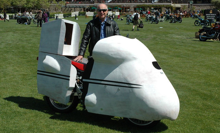 May 8, 2010: Alan Smith at the Gathering of Streamliners at the Quail May 10, 2010: Alan reports: For my fuel economy on the trip home had mixed riding conditions. The first 18-miles were done running around between your home and the Quail Lodge. I encountered strong cross winds to Gilroy then the wind became strong a head wind. My speed ranged from 50-70 Miles-Per-Hour. My speed was determined by my engine temperature. My gas mileage dropped to 103.368 MPG. So I reached my goal, well actually your goal, of 100-Miles-Per- Gallon on my trip to Carmel and back.112.5 MPG riding to Carmel: 112.5 miles/ 1.0 gallon of gas on all highway roads 103.3 MPG riding home: 138.1 miles/1.336 gallons of gas on mixed back roads and highway I would say that there is more room for improvement. I need to install a windshield, belly pan, etc. Right now I need to address the overheating problem, it just needs more air to flow across the cylinder. | ||||||||||||||||||