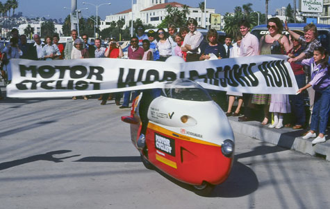 | What is going on? First, regarding mileage, my bike is not yet streamlined. I departed California unfinished because I simply ran out of time. Streamlining is one, smooth, continuous shape. This ain't it, yet. The body is still full of holes and gaps. I can only conclude that we will not see any consistantly measurable improvements in reduced fuel consumption until the streamlining is complete. But what about the semi trucks and sidewinds on those midwest interstates? The worst effects came from the winds blowing on the un-finished side of my bike... from the left. Will it get better when I cover the sides? I don't know. Most of you expert readers think it will get worse as the side is smoothed over. I do know this: The tail extension seems better than without it. The nose seems to have more effect. Top fuel economy pioneer, Matt Guzzetta, offers a clue. In 1984, Matt set a world's record, driving his 12 hp Vetter Fuel Economy Suzuki from Los Angeles to Daytona on 11.5 gallons of fuel, averaging 215 mpg for the trip. The speed limits in the US were 55 mph (until 1990) which is one of the reasons I got 107 mpg in my own contest, years ago. | ||||||||||||||||||||||||||||||||||||||||||||||||||||||||
