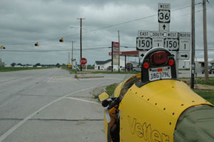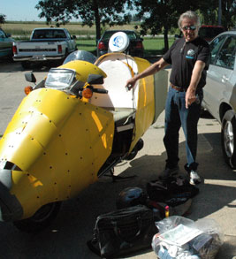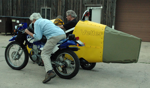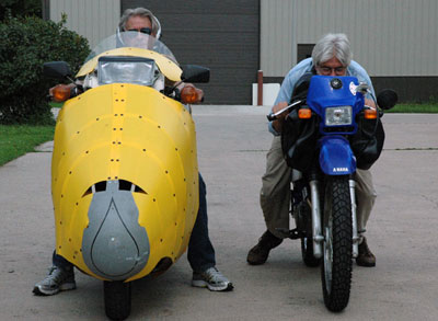 | In those days, we rode 34 hp, 350cc Yamahas that got 40 mpg at 65 mph. We liked the power. Today, in 2008, we want mileage. Today, our speeds were 65-70 mph. The winds were stiff. It was in the 90s. The fuel had 10% ethanol. We began at a grain elevator scales where my Streamlined Helix, with me on it, carrying about 50 pounds of gear, weighed in at 590 pounds. Bruce and his Yamaha, carrying nothing, weighed 470 pounds. I sat up. Bruce hunched over. Bruce knows the value of minimum frontal area. I know the value of comfort. I am older. | ||||||||||||||||||||||||||||||||||||||||||||||||||||||||