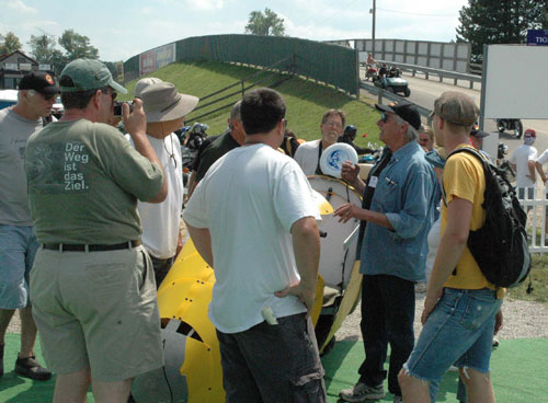 | Matt had built a special, extra 10 gallon tank up front. Gas weighs about 6 pounds per gallon, which means he had about 70 pounds of extra weight up front. See more in the August, 1984 Motorcyclist magazine. In my interview with Matt, he explained that with that extra weight up front, the effects of sidewinds were dramatically reduced. The effects of winds increased as the fuel burned off. This is a clue as to what can be done. "For good handling, the center of pressure needs to be at the rear and the weight up front" Matt Guzzetta's comments to me are recorded on my DVD: When I return to California, I will hang some lead off the front and see what happens. In the meantime, I was not prepared to be mobbed in Ohio. | ||||||||||||||||||||||||||||||||||||||||||||||||||||||||