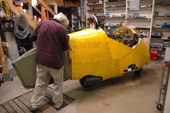 | Thin, lightweight plastics and a lot of foam are the future if we are to "Do more with less". Here my brother, Bruce helps to make a new foam tail that weighs 3 pounds. Remember... for good handling, the weight needs to be at the front... not the rear. This tail is intended for highway use, and is held on with bungee cords. For in-town riding, we don't need it and leave it off. Without the tail, the bike is as long as a regular Honda Helix. | ||||||||||||||||||||||||||||||||||||||||||||||||||||||||