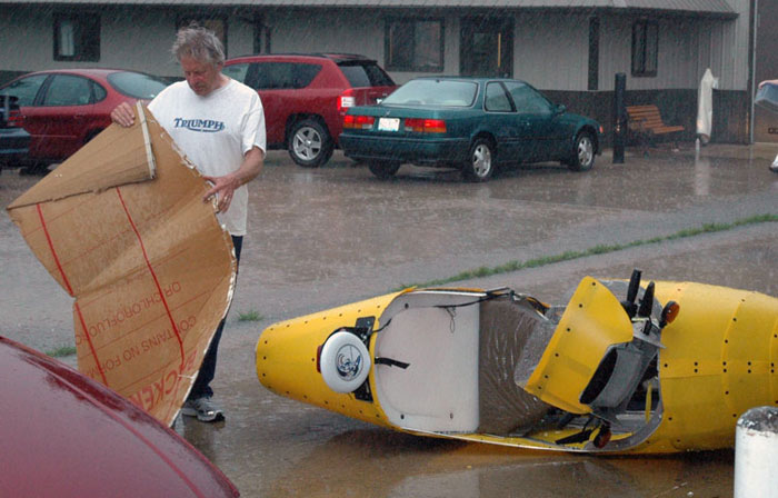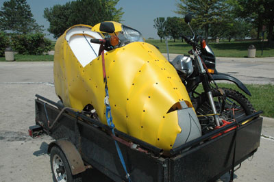 | On my final test ride before leaving, Carol noticed that the winds were denting in the front. This thin, yellow plastic was a little too thin. Too late to do anything about this. Reluctantly, I loaded it on my trailer and headed for Illinois and Ohio. | ![]() | |||||||||||||||||||||||||||||||||||||||||||||||||||||||