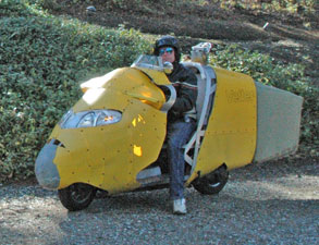 | The last time I was on this road, I got 48 mpg into fierce headwinds. Chapter 16. The streamlining was rougher then. Compare the differences around the headlight, handlebars and windshield, above. The Helix is not still not completely streamlined. The left side is still open, the front wheel is still a scoop. The bottom has no belly pan. But, it is smoother than it was in September. I was anxious to find out if these changes made any difference in mileage. My son, Zak, rode my stock, red Helix while I rode the streamlined Helix. Other than streamlining, both bikes are equal and un-modified. Altho Zak is bigger and outweighs me, my Streamlined Helix has 15 pounds of lead bolted in the nose. So we are probably very similar in weight. | |||||||||||||||||||||||||||||||||||||||||||||||||||||||||||||||||||