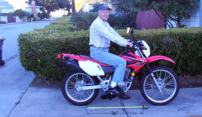 Here is Alan on his new Honda CRF 230. He is sitting up in normal riding fashion which is essential to happy, cross country cruising. Alan plans to streamline his bike and I offered to help. I asked Alan to lay a ruler alongside him so I could - through the magic of PhotoShop - lay a scaled Vetter Streamliner Fairing over him. | |||||||||||||||||||||||||||||||||||||