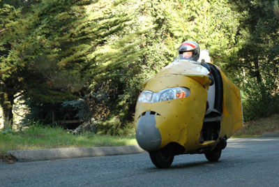 "I got an offer to test ride Craig Vetter’s “Freedom Machine”. What made me nervous was that except for Craig, I was the only other person to ride it. I never rode a streamliner until this year. Last July in Ohio I rode two streamliners at the “Gathering of the Streamliners”. Craig’s streamliner would be my third this year. After getting a short briefing on the controls I was turned loose. Actually the controls are straight forward, the same as a standard Honda Helix 250cc scooter. Craig rode with me on a Suzuki Burgman 400 scooter. I've ridden motorcycles and scooters from 1930 to present. It always feels awkward to get on a different bike. My first impression of Craig’s “Freedom Machine” was that it feels a little claustrophobic with all the aerodynamic panels surrounding me. Once underway I did not notice being enclosed anymore. Despite the bulky look of Craig’s streamliner, it felt very light. When we got out on the open road I wondered why Craig was going so slow. I looked at the speedometer we were already going over the 50 MPH speed limit. In a streamliner there is no wind blowing over a rider to give a sensation of speed. It is dead calm inside Craig’s “Freedom Machine”. Riding in hilly country one must be careful not to accelerate over the speed limit going downhill. | |||||||||||||||||||||||||||||||||||||
