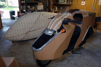 May 7, 2008: Riding I ride this all the time. (Except in heavy fog and drizzle.) Before I commit to the final design, I want to be sure this machine will be something I will really want to ride. Think of it like this: "Of all my choices, will this be my first choice to ride today?" If the answer is: "Yes" I figure I am on the right track. (The turtledeck stops all wind.) | |||||||||||||||||||||||||