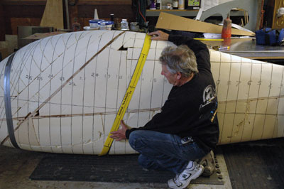 The real foam streamlined Photoshop layer is in place to see where the bulkheads go. The parallel lines on the foam make it easy to translate. These bulkheads are not made up of straight lines and will have to be made of rivited together sections of aluminum. The front bulkhead is just behind the front wheel. The middle is my seat back and the back one is at the end of the standard Helix. | ![]() | ||||||||||||||||||||||||