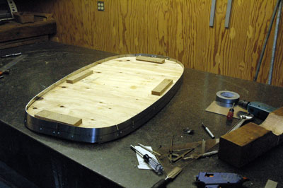 Now I can duplicate the band in reverse for the right side and put all the pieces together to make the bulkhead band. The resulting band is a wierd shape. None of the sides are parallel because they all fall onto the fishy shape. This is about two days work. But, It is worth the time. | ||||||||||||||||||||