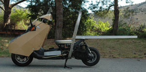 It is time to remove the CAD (Cardboard Aided Design) and strip my trusty Helix of its plastic bodywork. The foamboard has served me well, having servived a thousand miles of riding. Only twice did I have to return home because of rain. Well, it is California. As far as I am concerned, the actual riding with this bodywork is the most important part of the design process. | ||||||||||||||||||||