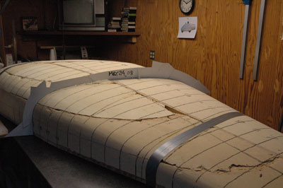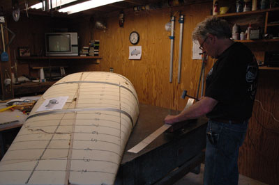 Once I am confident that I have the right bulkhead shape, I grab a section of the body. This is easy... I just use a razor blade and cut quick arcs and piece them together where they will fit. A hot melt gun sticks them together. Notice the my flat work table. It is not a work table at all. It is a Starrett granite "Surface Table." Dead flat. I can tell where the centerline is this way. My first fairing in 1966 was crooked because I worked from the floor, which sagged under my weight. It was not dead flat. | ![]() | |||||||||||||||||||
