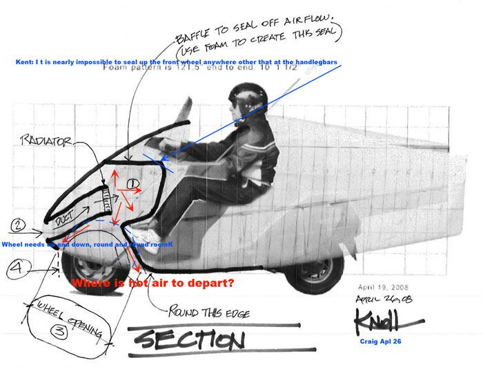 With all that said I now conclude my review with the following. Your video/lecture has taught me a great deal about what I have been working on. Not all of it was what I expected, but, in the end, all of it was exactly what I needed. The video was very well done and I will speak of it often when asked about this project, even if only to the shrinks in the booby hatch where they lock me up for doing all this. While the production quality isn't that of Al Gores video, I suspect he had a lot of money to make his, the message is as important, and is very complimentary. While he spoke of what is happening to the environment and who was to blame you spoke of why the transportation industry is getting worse and how it could be helped. While he spoke of Global issues which will come of this you spoke of things each individual can do to help. That said the video quality was pretty good on yours, better than I expected truth be told. I am glad I spent the money on it and will put it in the town Library when I feel I have watched it enough, that may take a while so I might order another for them. I may even buy them for the towns around me if my bonus is decent this year. I should note that I haven't bought An Inconvenient Truth. The only negative I will offer is this. You have left me feeling guilty enough to sell my beloved 2005 GS, downsizing to what I now know to be much more reasonable, and you have created a boat load of work for me this summer, dammit! Thank you very much for a great video! Craig comments: Thanks for a great letter. Christopher. Congratulations. you are getting the BIG POINTS. It is very hard to re adjust out thinking, isn't it? I began with a KLR and I am sorry to tell you that I have never been able to get over 52 mpg. Now, I just put a 36 T rear sprocket on it, so we will see. but, the KLR - at 36 hp - has too much power. You did not want to hear this, I know. I have come to believe that there is a big difference between 36 hp and half that. I don't think it is possible to get "fantastic mileage" like 100 mpg, sitting up etc, with 36 hp. My wife's BMW GS 650 gets 62-3 mpg, so it must be generating less than 36 hp. I am betting on my 17 hp Helix which begins at 64 mpg. It probably has too much horsepower but, what else is there? My brother is betting on his 21 hp Yamaha 220, beginning at 62 mpg. Fred Hayes is betting on his Deizil-ized, 24 hp KLR 650 and claims 90 mpg. Obviously something very wonderful is happening with Diesels. On May 4,Tim Culverhouse wrote: Hey Craig, I must say I am very happy that you are doing this work now, when I can actively follow it. As it happens, I was searching the internet for simple motorcycles modifications to increase gas mileage. I am happy to see that there are other people out there with similar goals (as opposed to the loudest pipes and the strongest engines). I am currently an engineering student, and as such, am continually frustrated with the ways in which auto-manufacturers attempt to increase mileage, especially since my 1997 Saturn gets better fuel economy than most cars marketed as high fuel efficiency vehicles, and my 1981 Kawasaki motorcycle gets better mileage than most new motorcycles. I think your ideas and designs are great, and can't wait to see the final results. I am already planning my own "Helix-liner" project for when I graduate. Thanks for the inspiration! PS. I was wondering what material you would use for your final fairings? I know you have used fiberglass in the past, but have you given any thought to carbon fiber? I know this would be a more expensive way to go, but the benefits of a stronger-than steel "cage" on a Helix would have huge safety advantages. Thoughts? I have a better idea. Stay tuned, Tim. It is not meant to be a sales job, but I highly encourage you to get my DVD. It is all about horsepower, as I see it. May 4, 2008, Steve wrote: Question # 1: How will you change the ratios of the helix? I don't know at this point. You are reading my mind, too, Steve I will ride it, streamlined to see if the existing CVT adjusts far enough out. I suspect it will not. Therefore, I have located a gear machinist who says he can do it. Are you simply going to reduce the preload on the driven face spring (PN 23233-KM1-000) or add weight to the centrifigal weights, so the gearing will be numerically lower for a given load? I don't think this will do a thing for us now... we want it geared higher. We can play with weights later to make the higher gearing better. I thought that at highway speeds, the spring is already full compressed and that a softer spring would only reduce the rate of acceleration. I'm not sure about that though. It is difficult to check! Clearance for fitting a larger diameter tire is limited by the transmission case. Another option is machining new final drive gears, but that would be very expensive. Maybe not...A jack shaft for a sprocket final drive with a relocated, larger wheel is another option. Ugh. Question # 2: Have you seen urethane foam that thick at home supply stores? The thickest pieces of insulation I have seen at Home Depot are 1". I believe the plastic faced foam you are describing is polyisocyanate. It is aluminum foil faced, which is hard to peel off. The stuff I picked up is 3 1/2" and 4". It came from a local big lumber yard, not Home Depot. I saw it by accident in the back where other defective materials were being stored. As I recall, they gave it to me because some corners were damaged. Actually, I don't know the kind of foam. It is not as good to work with as expensive modeling stuff but good enough for what I need. Some have product names on them... do you want a name? The recumbent bicycles that have competed at Battle Mountain have tapered to a point in the bird's eye view, but not the side view. In a cross wind, the bike leans into the direction of the wind. As the symmetrical airfoil shape rolls from vertical to horizontal, lift is generated and the bicycle becomes air