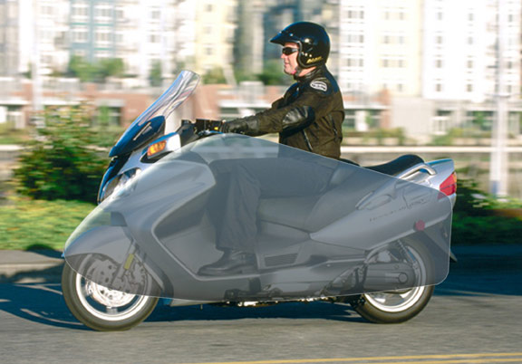 Standard Vetter Streamlined body kit superimposed over Burgman, proper scale. The Vetter Streamlined shell is the very same shell that contestants achieved over 400 miles per gallon with in the Craig Vetter Fuel Economy Contests. One of the reasons for such great mileage was that the riders in those contestests actually fit inside the shell. That guy really sticks up there. Frontal area is everything and this is a very dramatic demonstration of that. We will have to "section" the shell to make it fit the man. | ||||||||