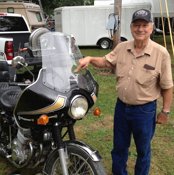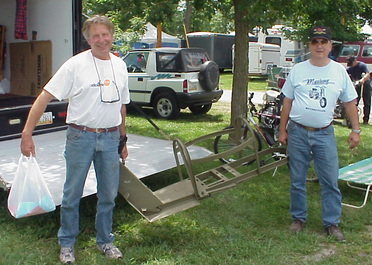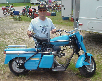 Fred with a rare and wonderful discovery: a Cushman Truckster engine. The blue bike is Fred's Cushman Eagle. He might have begun building this bike with nothing more than a rusty motor like the one on the left. It takes a lot of work and scrounging to make a bike like this... but that is what guys like Fred do for fun. | |
