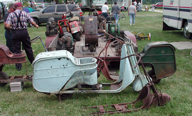 | 1944 Cushman Airborne Scooter chassis: A Real Treasure in 2002 How many people would recognize what we were carrying? Any of the old scooter guys at Portland would, actually. It seemed like everybody at Portland began riding on old American scooters. But the best part of Portland was the corn: | | |