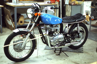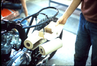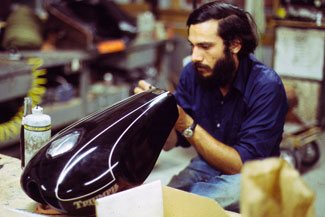 I recall being told that blue was the traditional color for Triumph. I tried blue but didn't like it, so we painted it black. Charly is finishing up the classic scallop striping. Note the recessed fuel cap. The hinge was at the rear. There would be no way the cap could open in a crash and hurt anybody | ||||||||||||||||||||||||||||||||||||||||||||||||||||||||||||||||||||||||||||||||||||||||