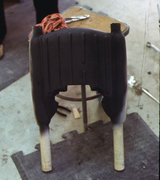 Cardboard attached to the Masonite sides with hotmelt glue provided a rough mandrel for the clay. I add clay, scrape it until it looks and feels right. |