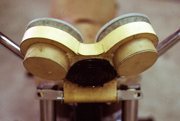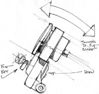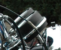 I put the horn between the meters so they could blast into an offender's ear. Strong, metal rings floated the meters in rubber. Right angled drives might be OK but I eventually decided to use the tach and speedo cables as bold elements of the design. | ||||||||||||||||||||||||||||||||||||||||||||||||||||||||||||||||||||||||||||||||||||||||