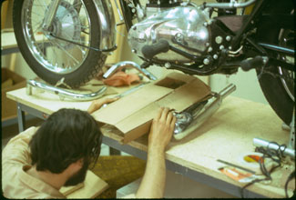 Triumph engineers were very worried about meeting the new sound requirements. The TT muffler was huge!