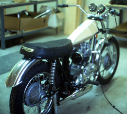 Jack sent me two of the new gold and white, 1972 Triumph Bonnevilles, one to ride, one to redesign. |
