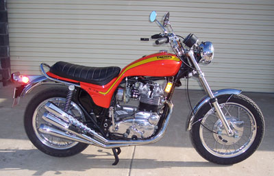 "I purchased this X-75 in late 1977 or early 1978 from K & W Triumph of Hatboro, Pa. I am the second owner (Pa. "B" title number). The original title date was 7/24/73. The VIN number is PHO1435. I rode the Hurricane up to the mid 90's, then parked it in the garage. I think I drained the tank, or least shut off the petcocks and drained the carbs. Hopefully, all it needs is a battery, clean the tank & carbs and a tune up. | |||||||||||||||||||||||||||||||||||